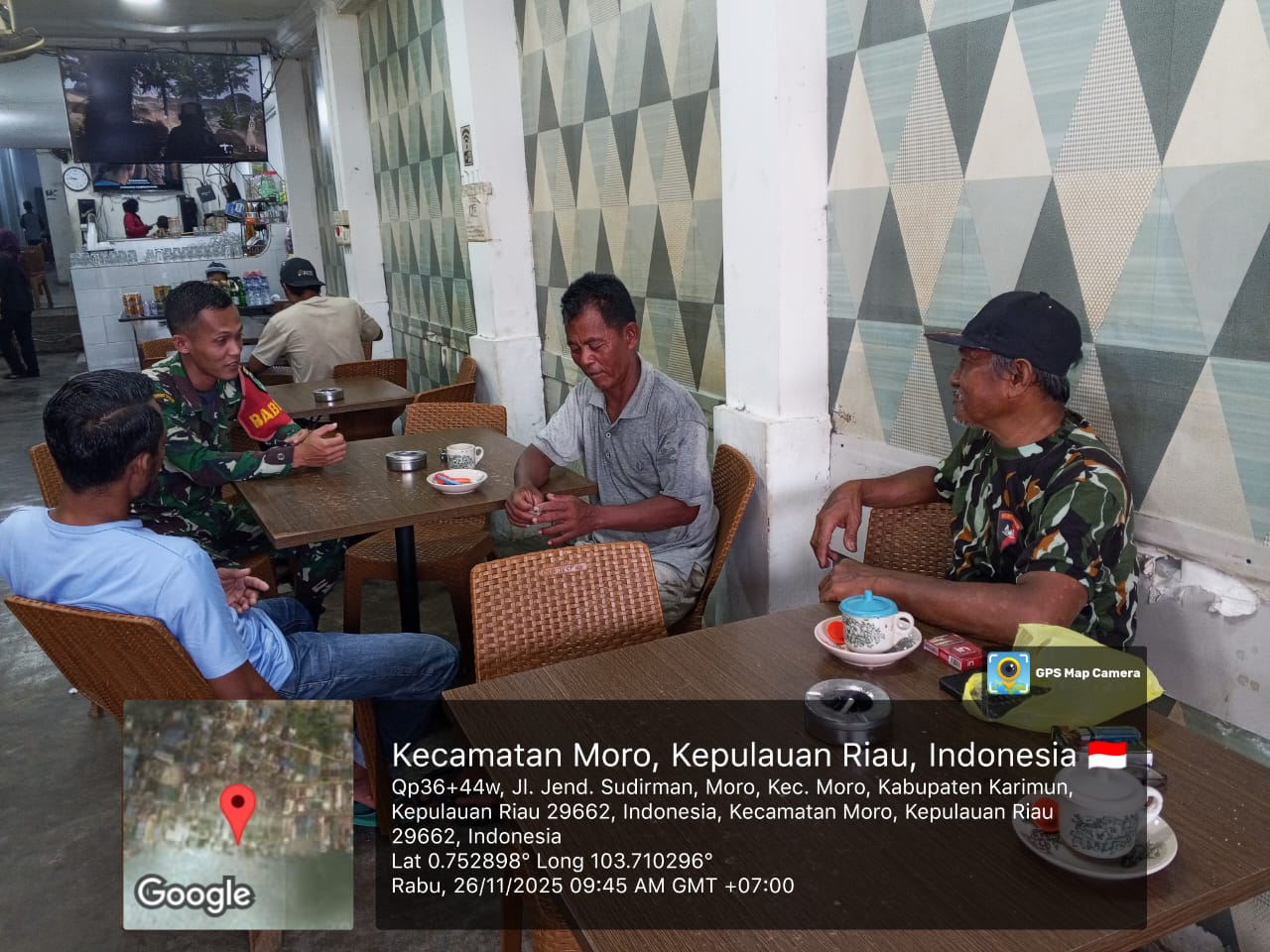 Moro, 26 November 2025 – Babinsa Desa Pulau Moro Koramil 02/Moro, Sertu Zakki Zainal Maftuh, melaksanakan kegiatan komunikasi sosial (Komsos) bersama warga binaan di Kedai Kopitiam, Kelurahan Moro Timur, Kecamatan Moro.