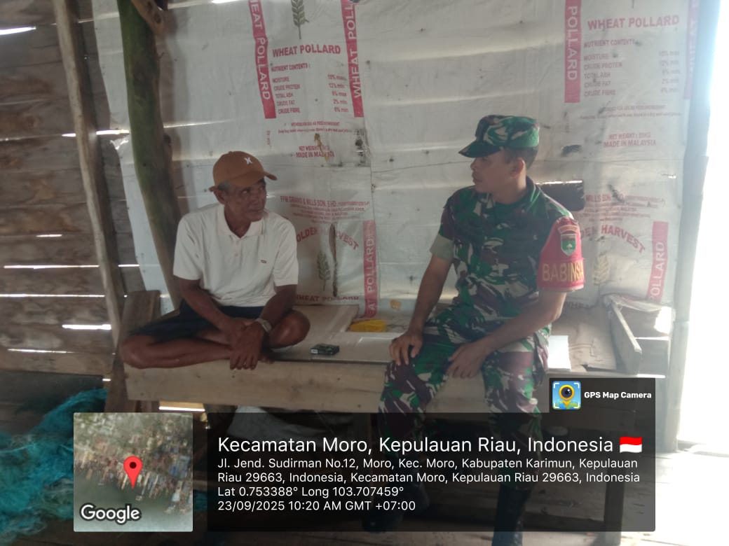 Moro, 23 September 2025 – Babinsa Kelurahan Moro, Koramil 02/Moro Kodim 0317/TBK, Serda Sahrudi Harahap melaksanakan kegiatan komunikasi sosial (Komsos) dengan warga binaannya di Kampung Benteng, Kelurahan Moro, Selasa (23/9).
