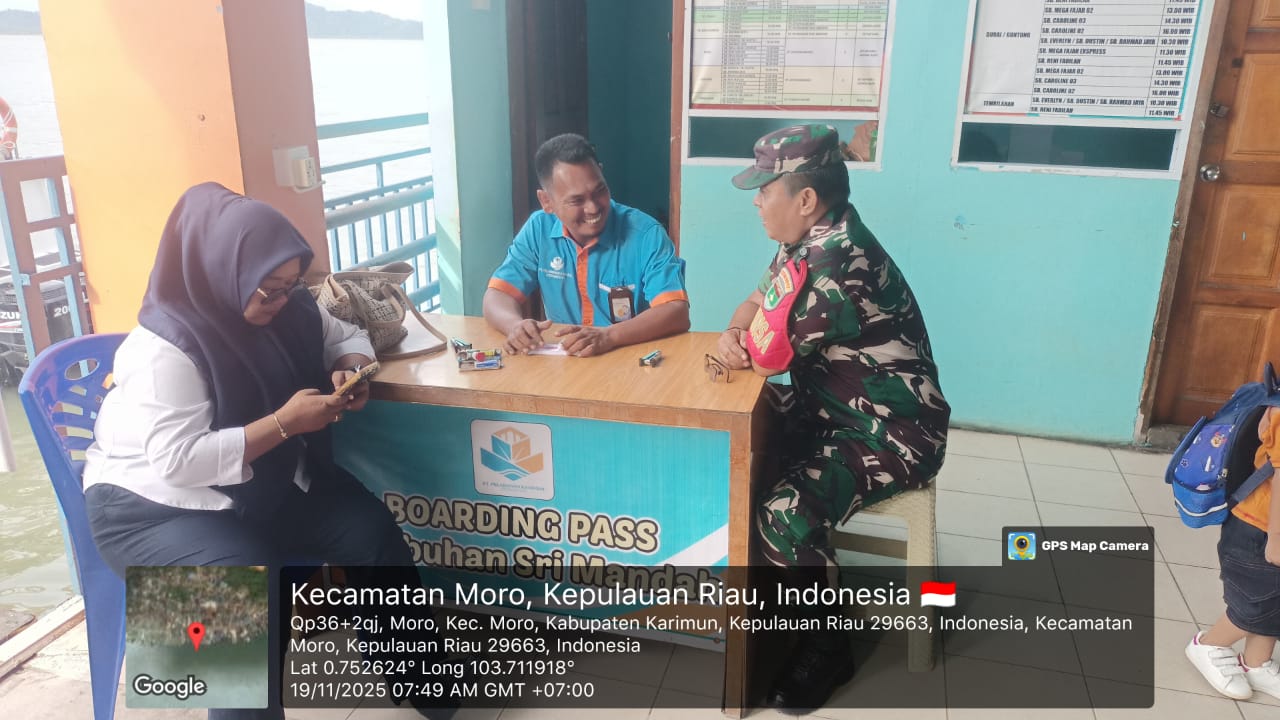 Moro, 19 November 2025 — Babinsa Kelurahan Moro Timur Koramil 02/Moro Kodim 0317/TBK, Serda Benny M., melaksanakan kegiatan Komunikasi Sosial (Komsos) bersama petugas pelabuhan Sri Mandah pada Rabu pagi.