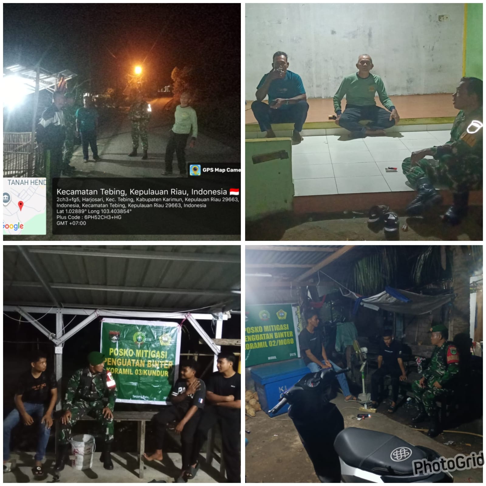 Sementara di Koramil 03/Kundur, kegiatan dilakukan di Jalan Tanah Tinggi RT 04 RW 08 Kelurahan Tanjung Batu Kota Kecamatan Kundur, mengawasi aktivitas malam sekaligus mencegah potensi kerawanan. Untuk Koramil 04/Tebing, personel menyasar Kampung Bangun Sari Kelurahan Harjosari Kecamatan Tebing sebagai bagian dari penebalan pengamanan.