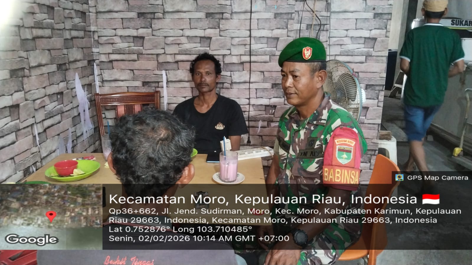 Karimun, 2 Februari 2026 – Serma M. Amin, Babinsa Desa Sugie Koramil 02/Moro Kodim 0317/TBK, melaksanakan komsos dengan nelayan di Desa Sugie, pada hari Senin, 2 Februari 2026, pukul 10.30 WIB. Kegiatan ini bertujuan untuk meningkatkan jalinan silaturahmi dengan masyarakat yang keseharian sebagai nelayan.