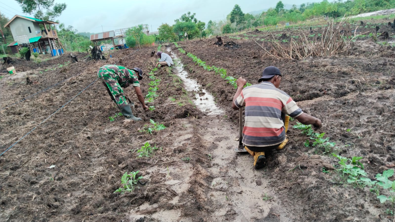 Dalam kegiatan ini, Serma M. Amin melakukan perawatan tanaman semangka di Demplot Koramil 02/Moro Kp. Wonorejo Dusun 01 Rt 03/RW 02 Desa Sugie Kec. Sugie.
